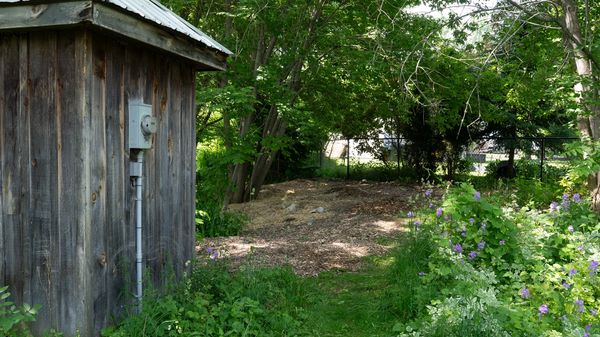 The trail starts behind the four out-buildings beyond the Friendship Pole. The older structure is the actual cupola from the Musical Barn. Near this is the former location of the dam that provided water for the Coldwater Mill. The lands that were flooded due to the dam were owned by the Mill.